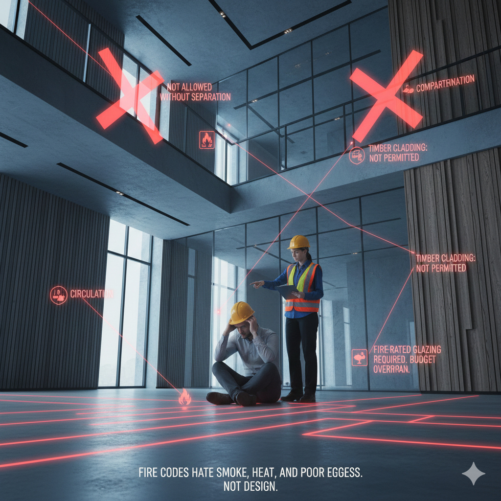 The open mezzanine you loved? Not allowed without separation. That gorgeous timber cladding in the corridor? Not permitted on that wall type. Your stunning glass partition? Must be fire‑rated — at a cost you never budgeted for.